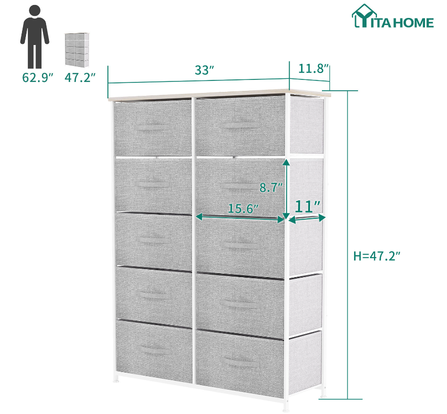 LARGE STORAGE CAPACITY - 10 drawers of different sizes provide ample storage space and are easy to organize. Overall dimensions: 33" L x 11.8" W x 47.2" H. Drawer dimensions: 15.6" L x 11" W x 8.7" H.
