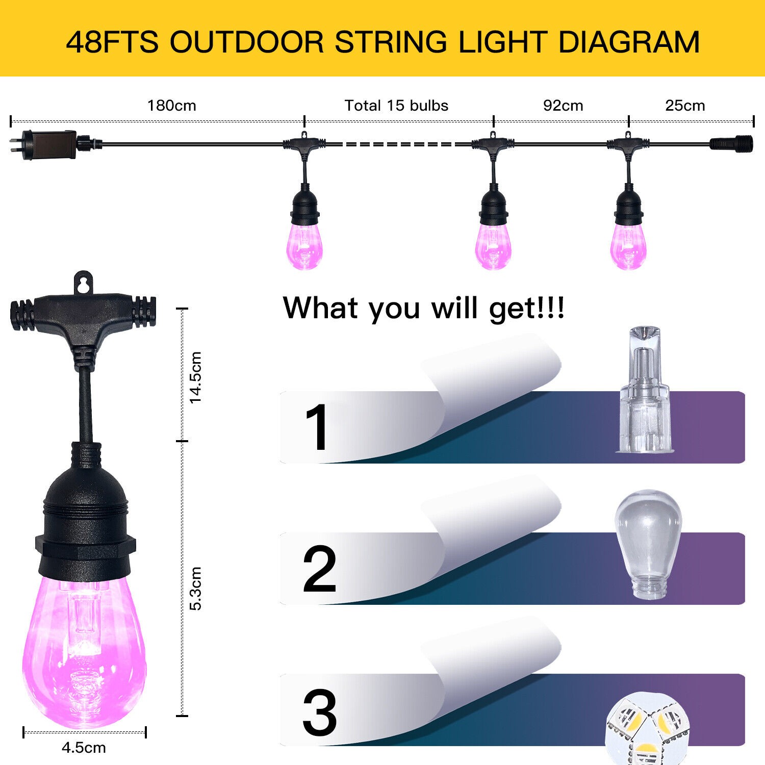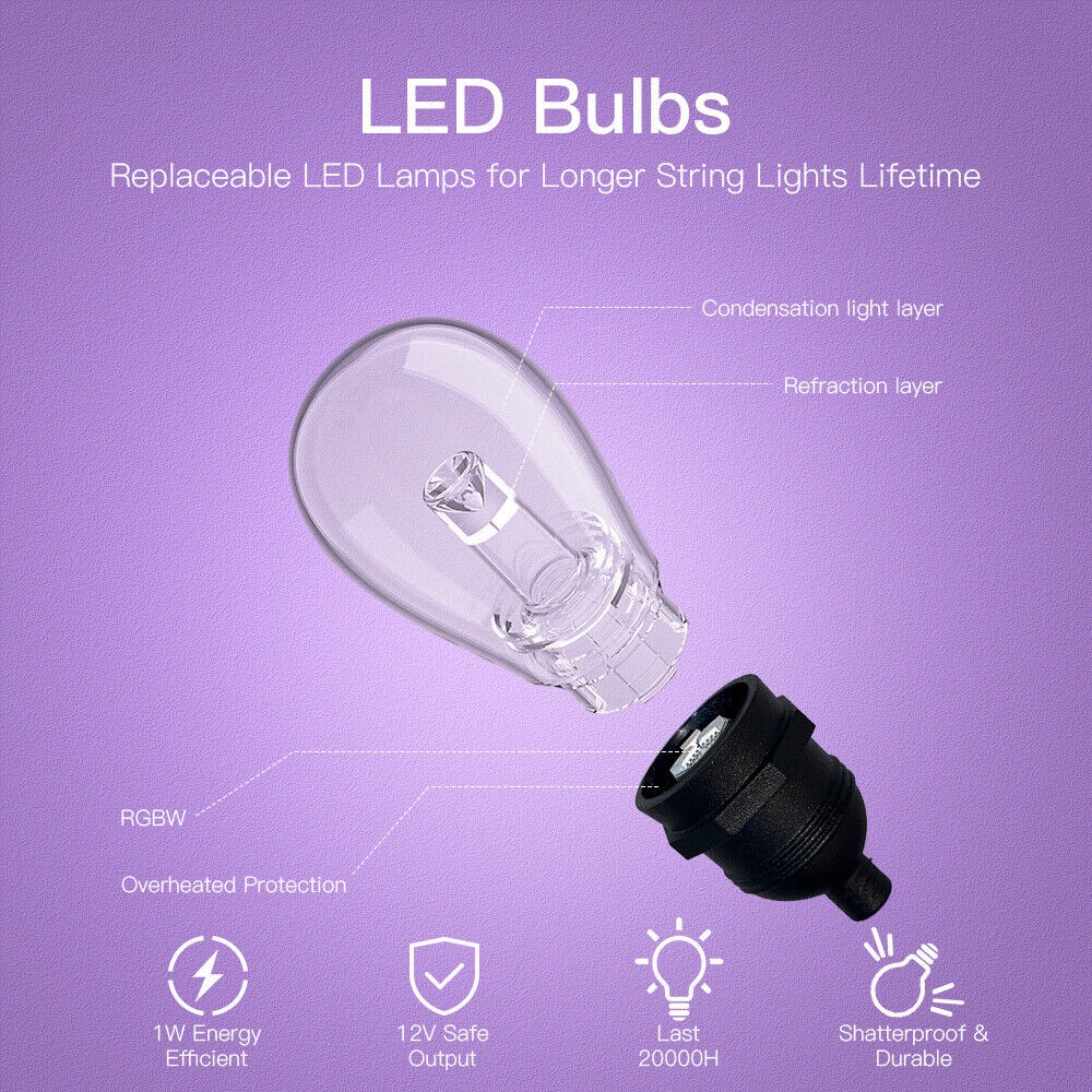 ?Connectable Festoon Lights--- Up to extend connect 3 string lights kits together (Each set 15M/48ft) by Male-Female connector, and up to control 45 Bulbs via WiFi App directly, no need to pair again; Ideal for patio, deck, backyard fence, pergola, porch, bistro, cafe.