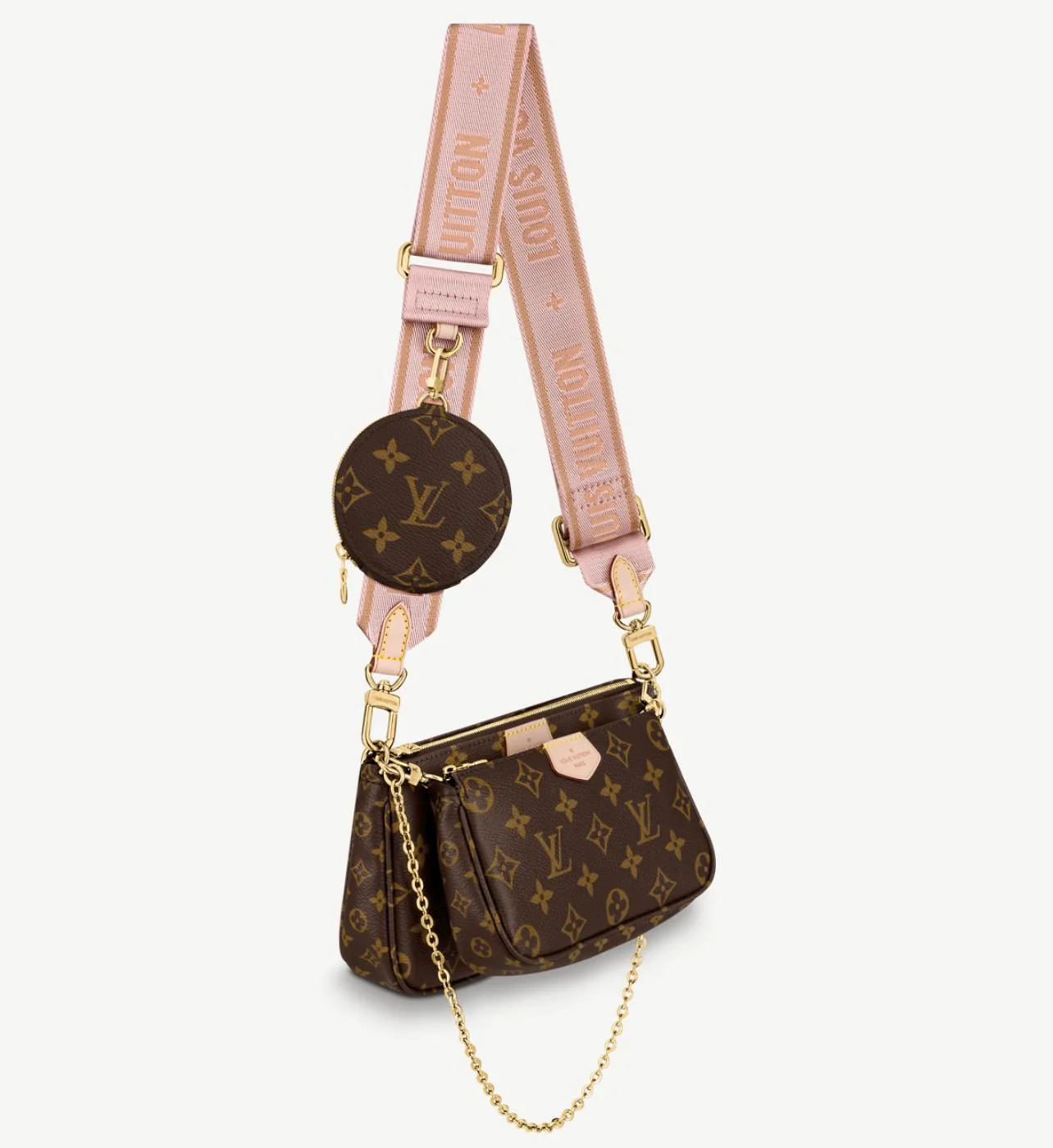 The latest 3 in 1 brown clutch/purse by LV is a cross body bag with several pockets and compartments, including a round coin purse. It has a detachable gold-tone chain strap and an adjustable belt for various carrying options imprinted with the logo on it.