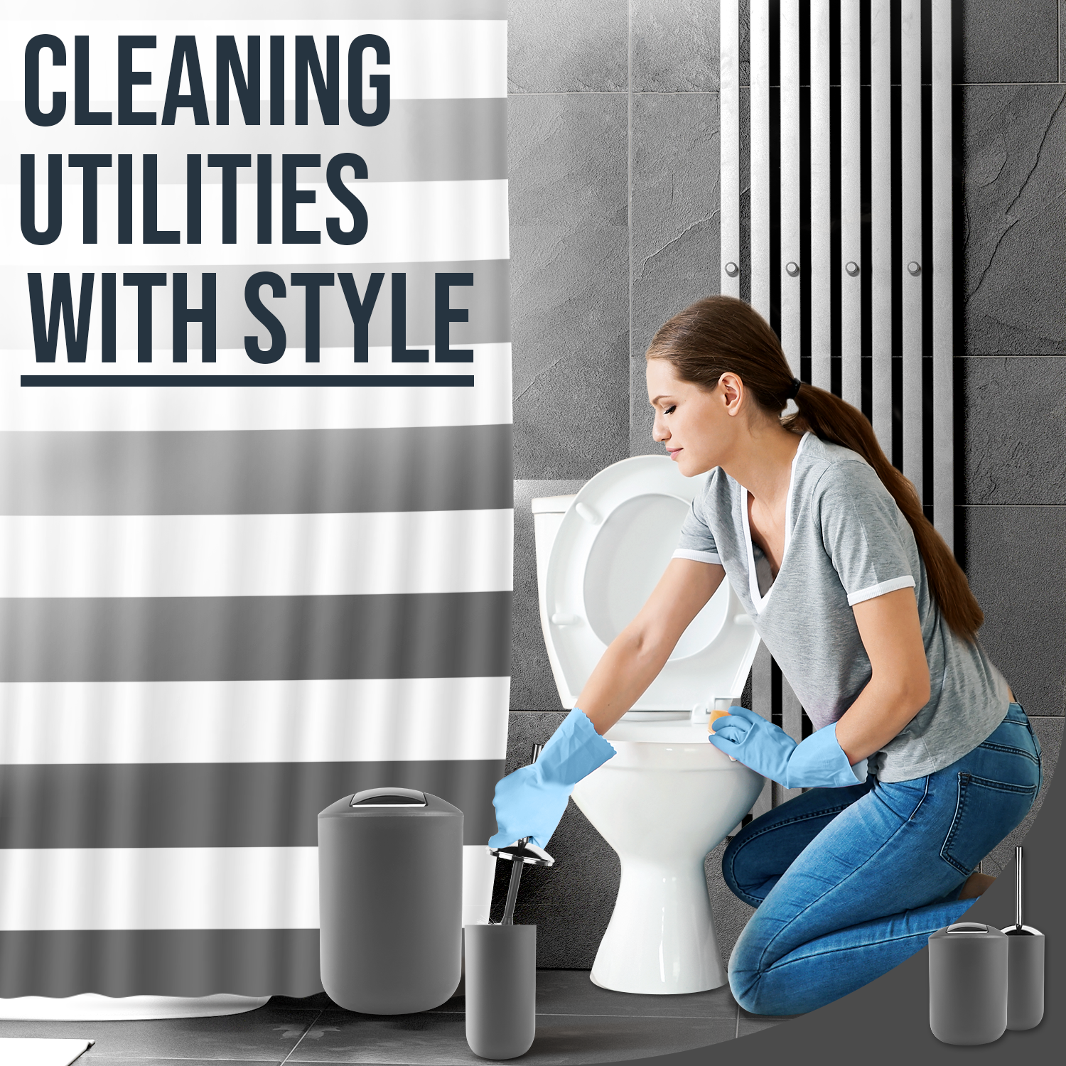 Shower Curtain, Shower Curtain Liner, Bin, Shower Curtain Hooks, Soap Dish, Soap Dispenser, Toilet Brush & Holder Set, Toothbrush Holder, Tumbler