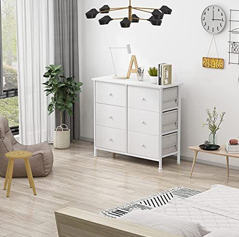 [White Dressers & Chests of Drawers]: Features 6 removable storage drawers made of high-quality non-woven fabrics, wooden front , Wooden handle is not only convenient but also beautiful,no matter kids or adult. Overall dimension: 31.5''*11.8''*28.7''.Drawer dimension: 14.6’’*11.8’’*7.9’’. [Wooden Top and Front ]: This white cloest dresser drawer organizers has water-resistant wood top and particleboard drawer front,offer stable support and ensure years of use,convenient to clean. [Strong and Sturdy System] : High quality steel frame,each drawer has a special Velcro strips to keep the drawers always at their slots,super easy to slide in and out but will not bend or fall down. anti-tipping straps ensure the safety of your energetic kids. [Easy Assembly and Move]: Easy to assemble with hardware included in half an hour,4 adjustable feet protect your floor from scratches. It's lightweight so you could move to any room you want to be tidier easily. [Mutifuction Fabric Dresser]: Smaller dimension with larger capacity fits everywhere in your house for closets, bedrooms, nurseries, playrooms, entrance passages,office, nightstand etc. 100% Satisfaction customer service before and after purchase. |