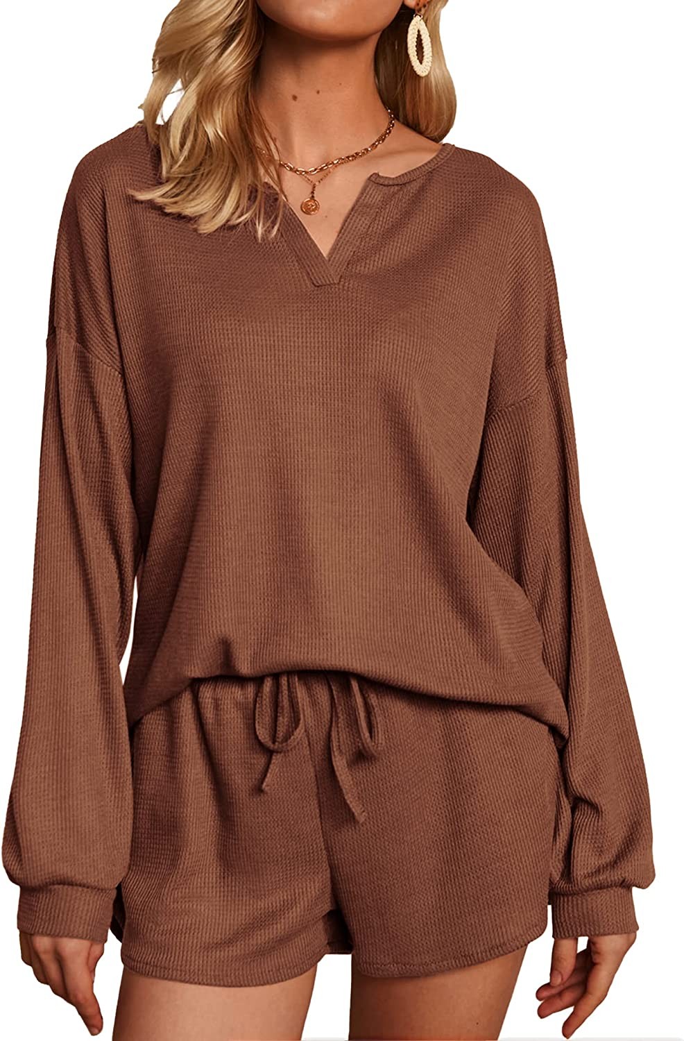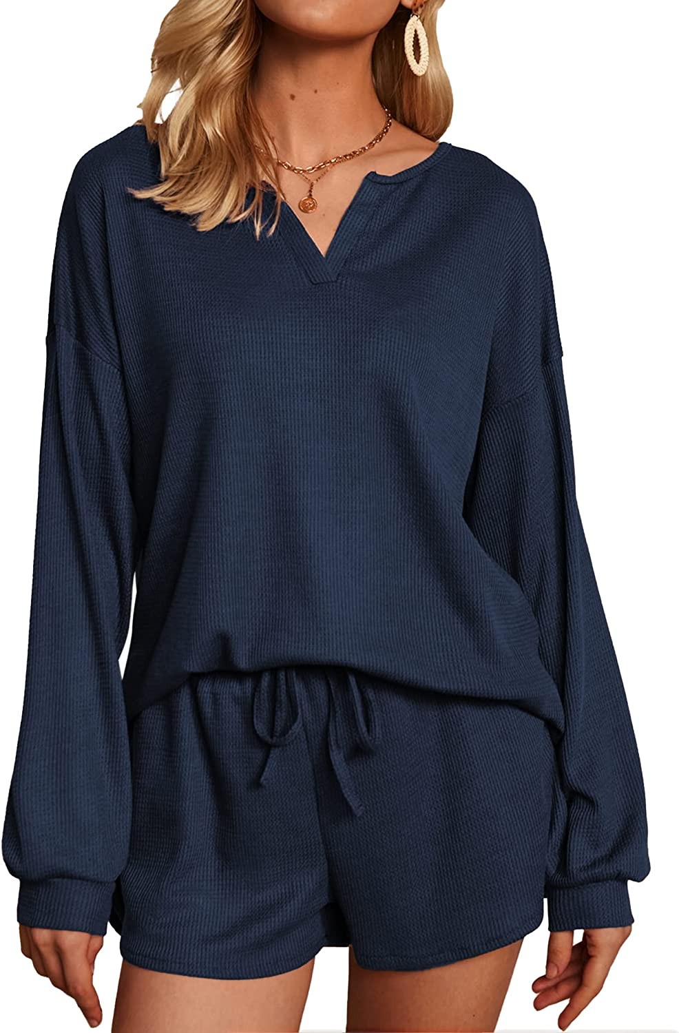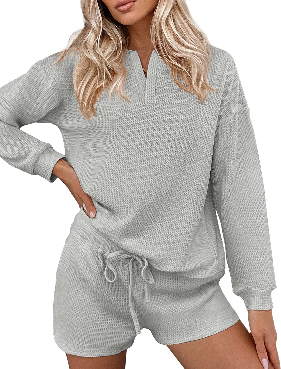 Ekouaer Pajamas Womens Waffle Knit Lounge Set Long Sleeve Top and Shorts 2 Piece
