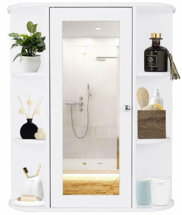 Simple and Beautiful Design:The bathroom wall cabinet has a simple and stylish design, woody material is full of texture. The design of the mirror door is unique. Both sides of the shelf is not only practical, but also beautiful in appearance. It is conveniently store towels, medicines ,tableware or other things, meanwhile to add a modern feeling to your home. It is a ideal option for you