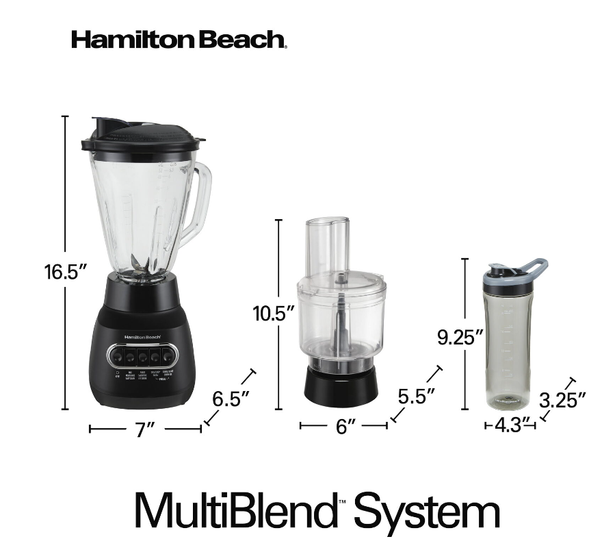 The versatile Hamilton Beach Multi Blend Kitchen System does the work of 3 separate appliances: a traditional kitchen blender, a food processor, and a personal blender. It has a powerful motor with 800 watts of peak power that crushes ice, blends, mixes, chops, slices, shreds and more. A single Multi Blend Blade System handles all your blending and food processing needs. Just choose the right attachment: the 52 oz. glass Multi Blend Jar, the 20 oz. personal jar for single-serve smoothies and shakes, or the food processor attachment with an included slicing and shredding disc. Use the 52 oz. glass blending jar with drip-free pouring spout to make a batch of milkshakes or to puree fresh pasta sauce. Or, swap the jar for the 3-cup food processor attachment to chop vegetables or mince garlic for a stir fry; it includes a chute and food pusher to make adding foods easy. The single-serve 20 oz. travel jar is perfect for morning smoothies when you're in a hurry. It's BPA free and includes a leak-proof lid for drinking on the go. Designed for quieter blending, the Hamilton Beach? Multi Blend Kitchen System is easy to operate, with all the power you need and simple controls.