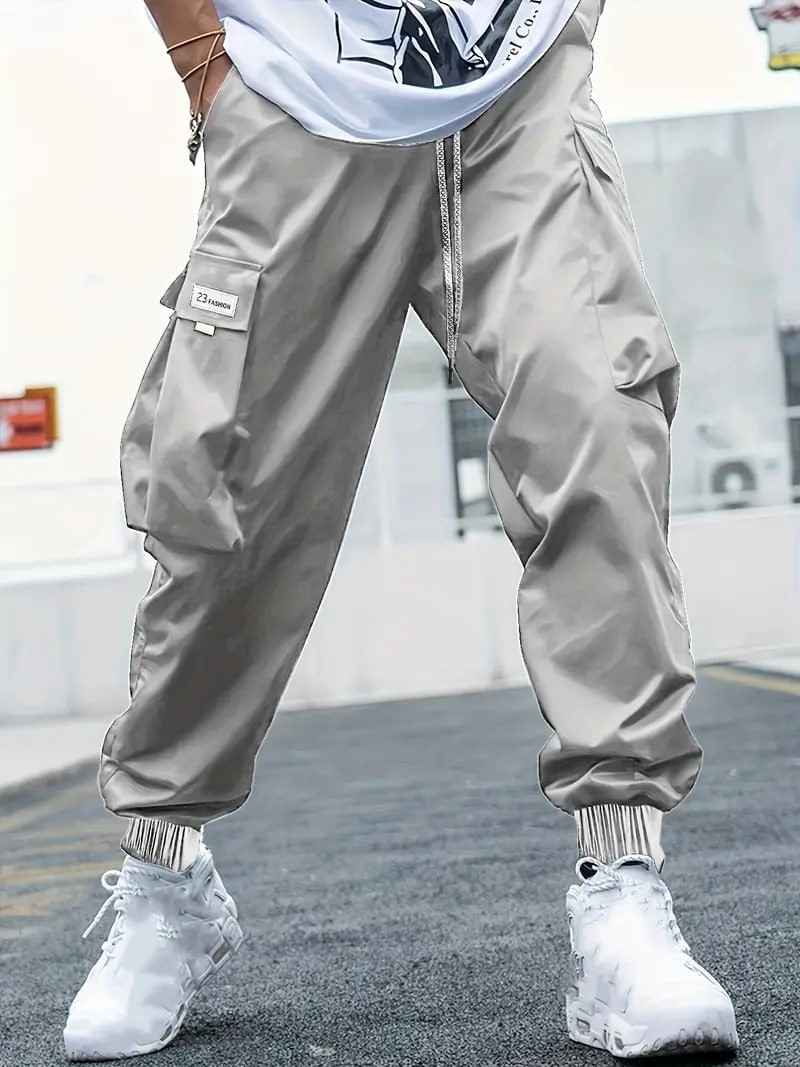 Plus Size Men's Drawstring Cargo Pants: Letters Print, Multi-Pocket Design, Perfect For Outdoor Activities