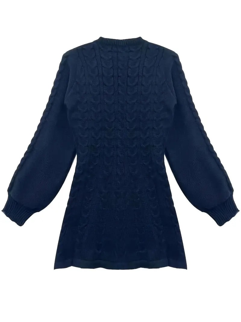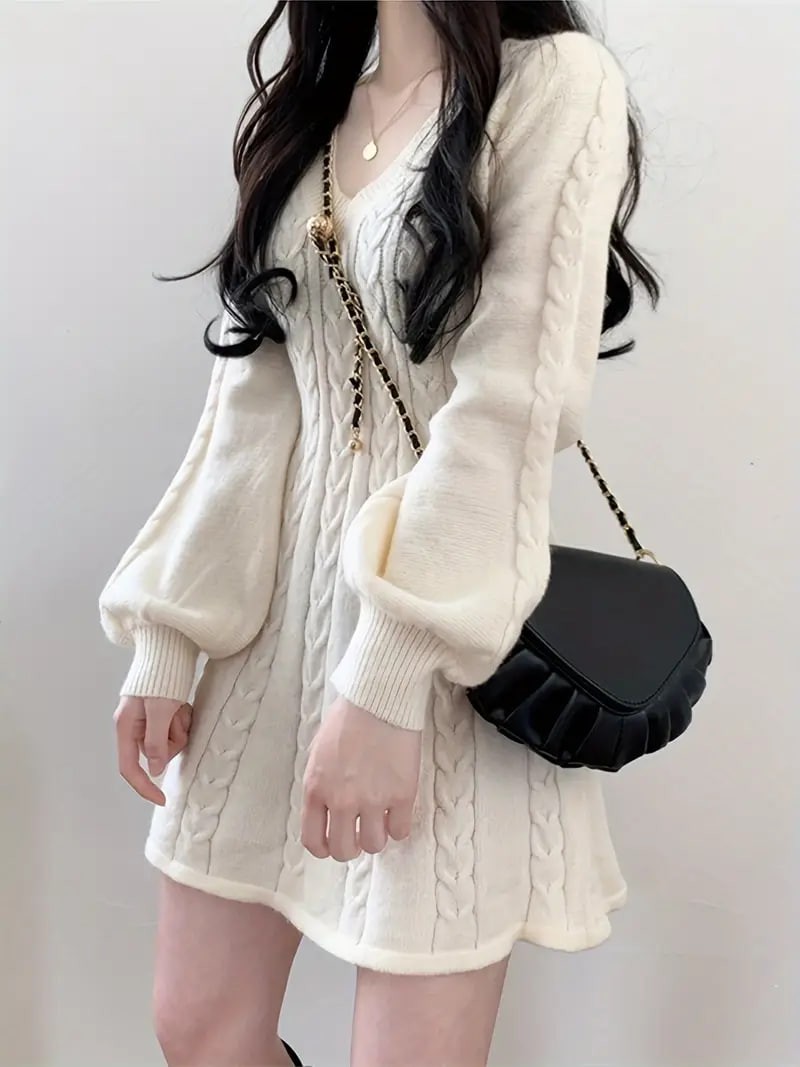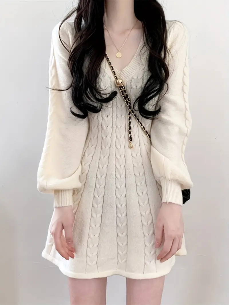 Solid Cable Knit Dress, Elegant V Neck Lantern Long Sleeve Dress, Women's Clothing